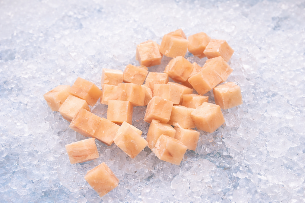 - Cięcie z bloków mrożonych filetów pozwala utrzymać zwartą strukturę kostek.