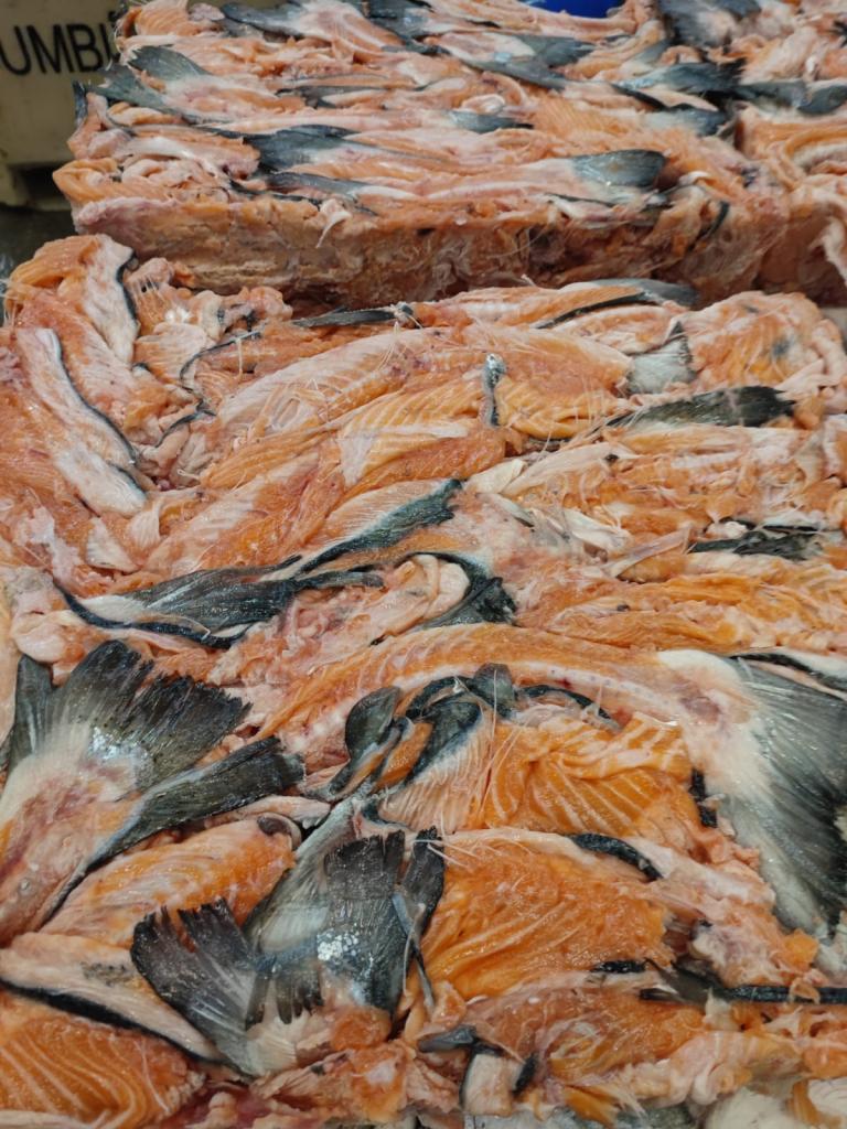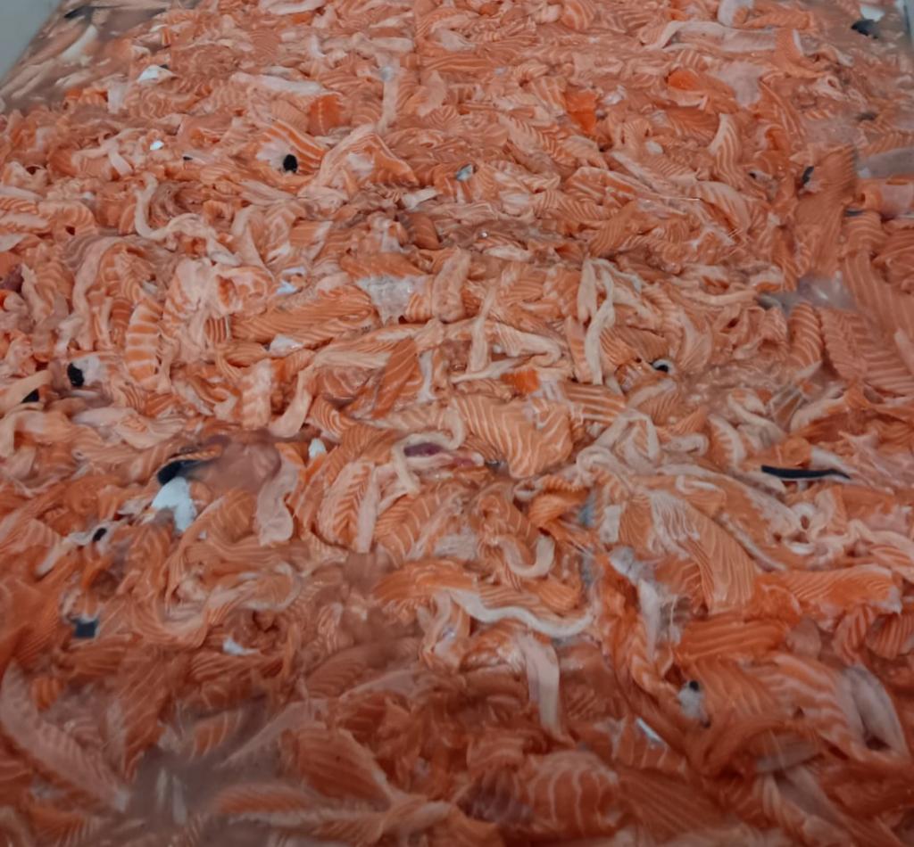 Forma: bloques congelados de subproductos de salmón (cabezas, espinas, pieles, recortes)