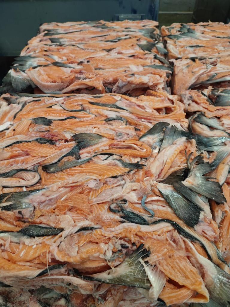 | Właściwości organoleptyczne | Dobrze zamrożony blok z odsortu po farszowaniu łososia atlantyckiego, bez uszkodzeń |